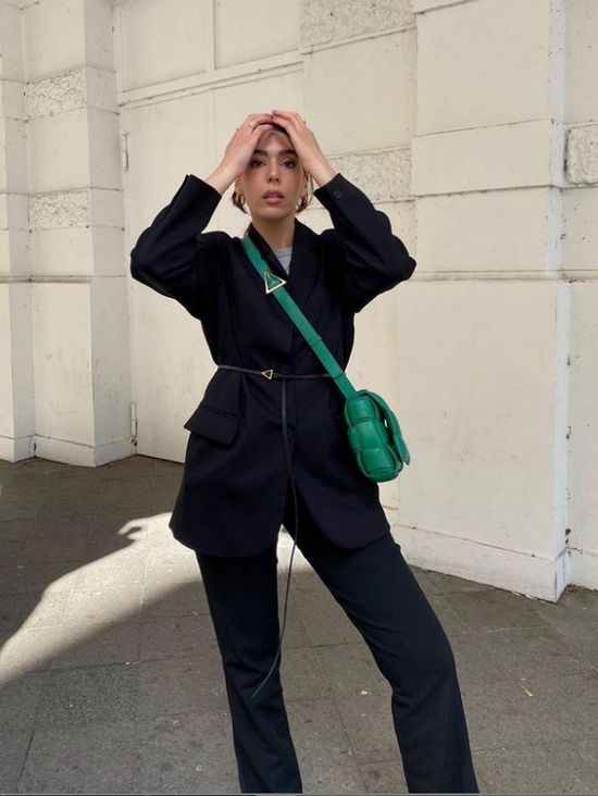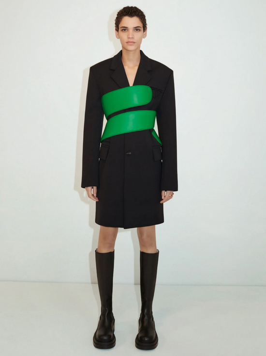 BOTTEGA VENETA有一套Look非常吸睛,就是这个绿色的大束腰,随便搭配在一个黑色大衣或者风衣上,都会立刻增强气场。