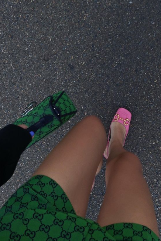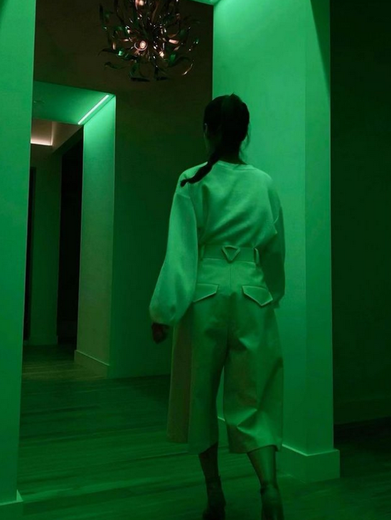 如果你是个穿搭的高阶玩家,可以用荧光色来搭配这种科技绿。就像Hailey Bieber一样,直接用荧光绿外套搭配这种科技绿,用色非常大胆而且好看。