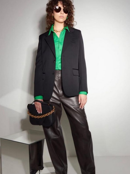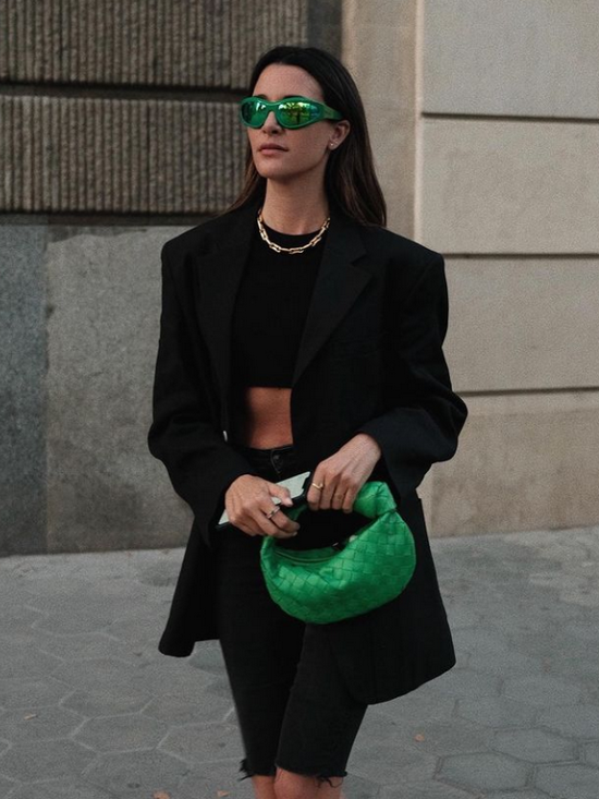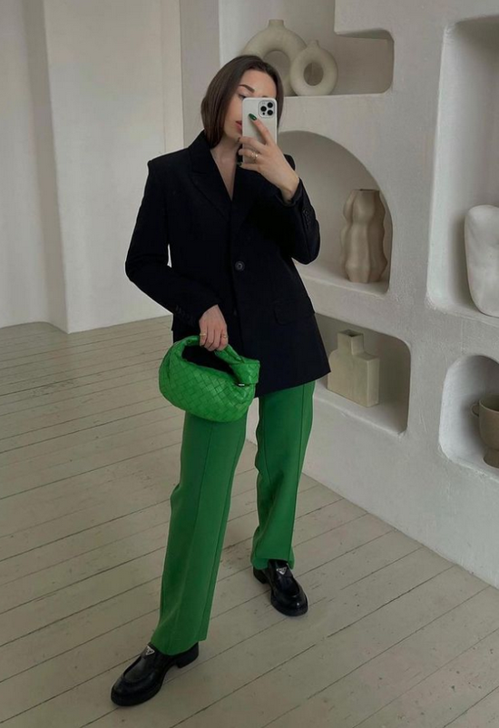 例如我们选一件绿色的包包,作为点缀的话搭配黑色的Look是非常好的选择。通体的黑上点缀一点绿,简直是酷极了。
