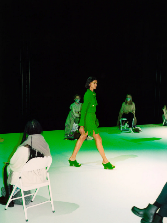 在时尚圈,这种绿被Bottega Veneta用得驾轻就熟。设计师Daniel Lee在秀场上用科技绿为自己的新系列注入了活力。