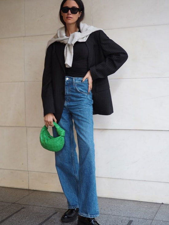 偶尔来一点牛仔元素看起来也不突兀,而且这只绿色包包就是起到一个画龙点睛的作用。