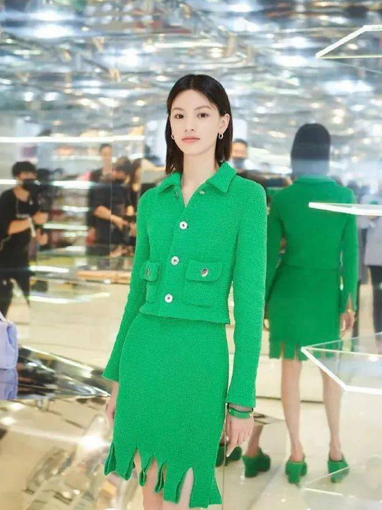 而且Bottega Veneta还推出了一款绿色套装,很多女明星都穿过它。虽然是一整片的绿色,但针织的质地非常显气质。