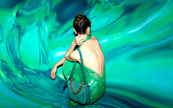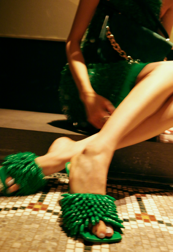 但如何Hold住这一身绿也是需要技巧的,Bottega Veneta的通体绿单品,通常都非常精简巧妙,无论是露背,还是衣服上的亮片装饰,或者是网眼绿色高跟鞋,搭配起来都毫不违和。