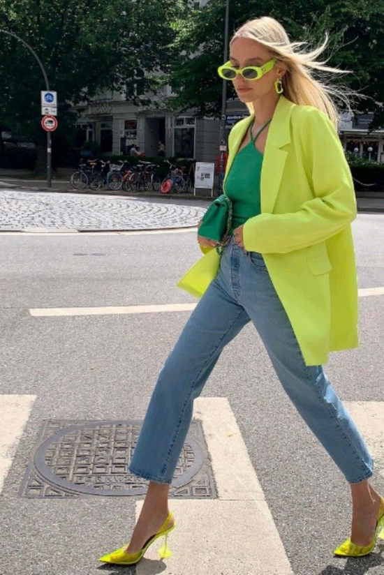 除了荧光色,撞色也不失为一种很大胆的选择,谁说红配绿不好看的?