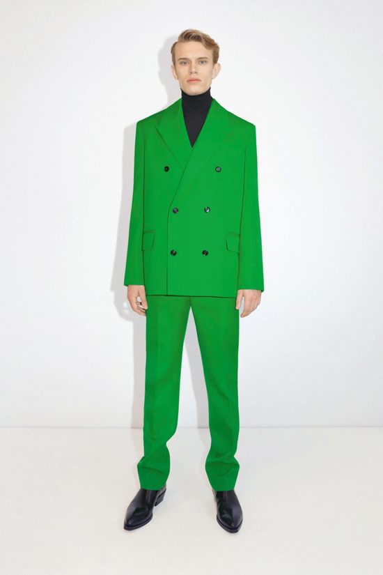 另外还有绿色衬衫,在西装外套下若隐若现。而且现在非常流行的穿法是,将绿色领子搭配在外套外面,就有一种呼之欲出的感觉。