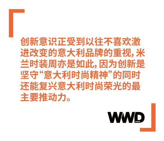 创新意识正受到以往不喜欢激进改变的意大利品牌的重视,米兰时装周亦是如此,因为创新是坚守“意大利时尚精神”的同时还能复兴意大利时尚荣光的最主要推动力。在接受 WWD China 采访时,Carlo Capasa 表示:“尽管目前仍有很多不确定性以及困难,我们仍然非常自豪地为大家呈现一个日程丰富的时装周。同时也再次证明了米兰作为重要的全球时尚之都的领军角色。我认为这是为时尚行业注入新动力的积极的信号”,同时他也表示:“多年来,意大利时装业将继续与中国时装业和零售业保持良好的合作关系。并将通过各种项目为中意文化和时尚产业交流架起桥梁。从 2021 年 9 月开始,我们还与腾讯视频共同组织了米兰时装周对话,围绕重要的、流行的时尚话题,提供一个更深入的交流平台。”