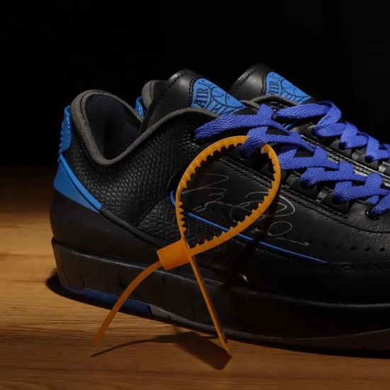 与‘芝加哥’配色同步发售的就是这双‘黑蓝’配色的 Off-White™ x Air Jordan 2 Low,同样的设计尽在配色上做文章,但是表现出的味道却大不一样。