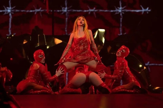 演唱会之中最受瞩目的便是这件‘裸钻尤物’,由澳洲设计师Heather Picchiottino定制完成,以趣味‘错视’手法打造出极致性格的外观造型。这样的裸体印花设计早在上世纪九十年代便由设计师Jean Paul Gaultier推出,前段时间的Y/ProJect x Jean Paul Gaultier 系列便将这一设计语言再现,成为近期时尚圈趋势话题的同时,也让这样的视觉概念设计走进大众视野。